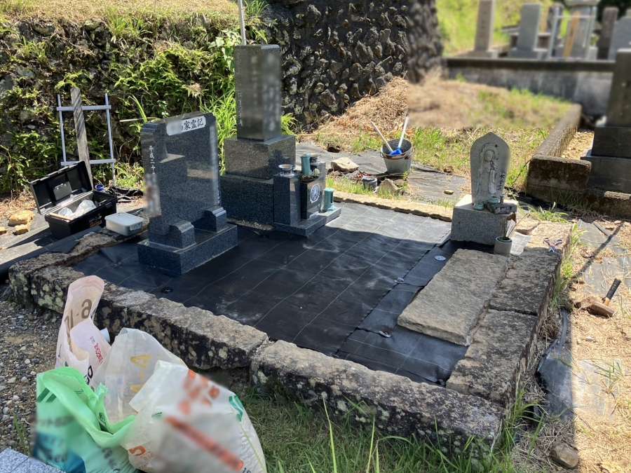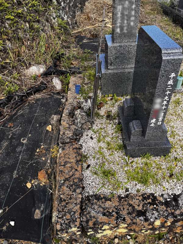 こんにちは。三重県・和歌山県南部にてお墓のお仕事をさせていただいております、湊石材店の湊です。御浜町寺院墓地にて、遠方にお住まいのお客様より、防草シートでの雑草対策工事をお任せいただきました。