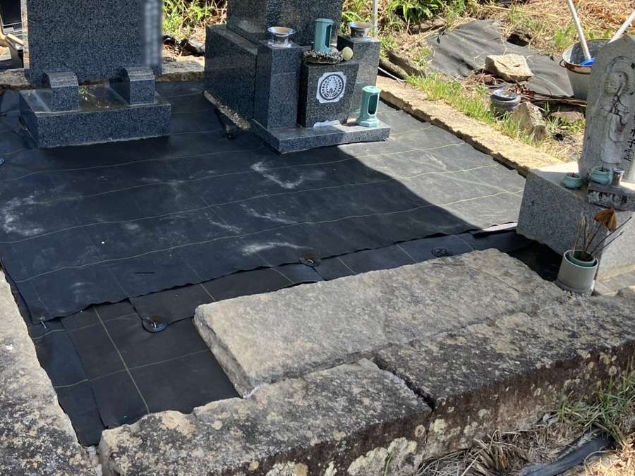 御浜町寺院墓地にて、遠方にお住まいのお客様より、防草シートでの雑草対策工事をご依頼いただきました