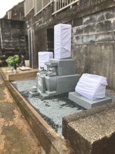 今回の工事の工程としては、お墓をいったん解体して洗浄、乾いたら色の入れ直し、据え直しを行って、最後に伊勢砂利を敷き詰めています。代々のお墓は少し傾きも見られましたので、据え直しでまっすぐになりました。