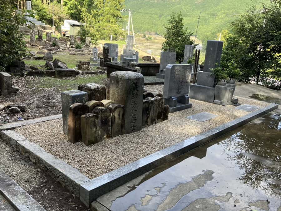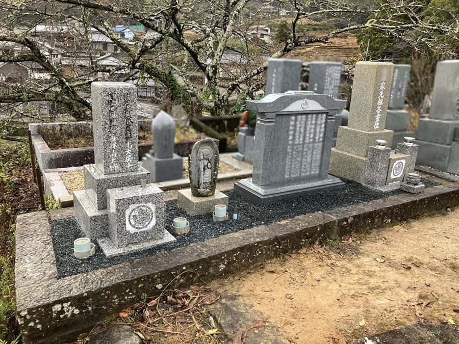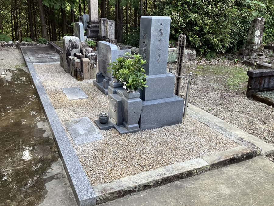 御浜町の寺院管理墓地にて、外柵ブロックの一部補強やお墓のクリーニング、土間の舗装を行いました。