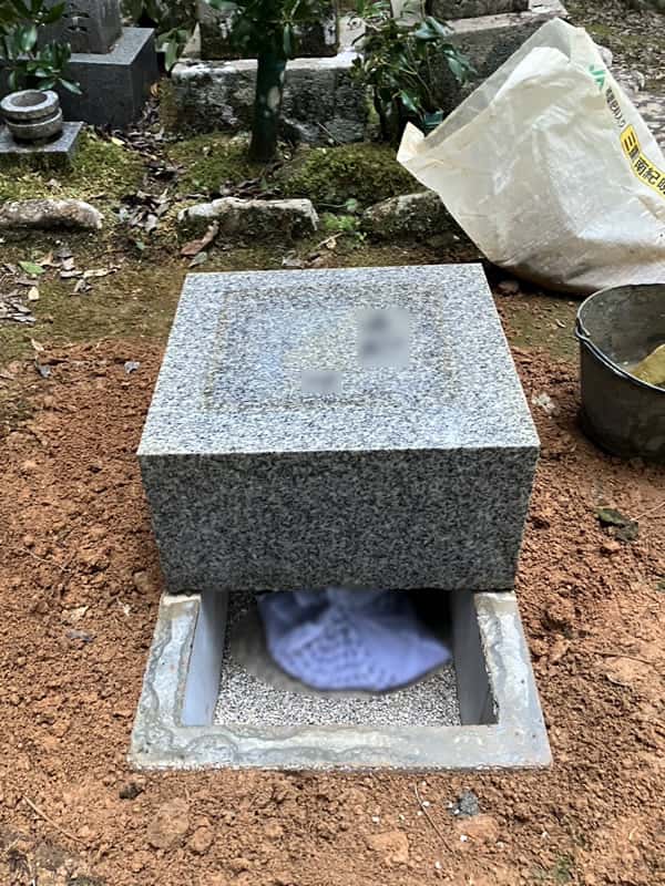 土が外柵よりも上に盛り上がり、さらに苔で覆われていました。また、手前の枠石や墓石の汚れも気になっておられました。墓石は工場へ持ち帰ってクリーニングして色の入れの直しを行い、外柵は現地でサンダー仕上げをしてきれいにしました。前面の巻き石の上に2寸の厚みの石を追加して高さを出し、納骨桝の高さまで土を入れることができました。
